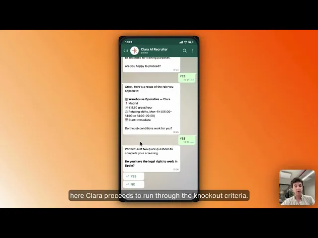 Clara then reaches out to the candidate via WhatsApp and pre-qualifies the candidate with a series of questions specifically created based on your role requirements.
