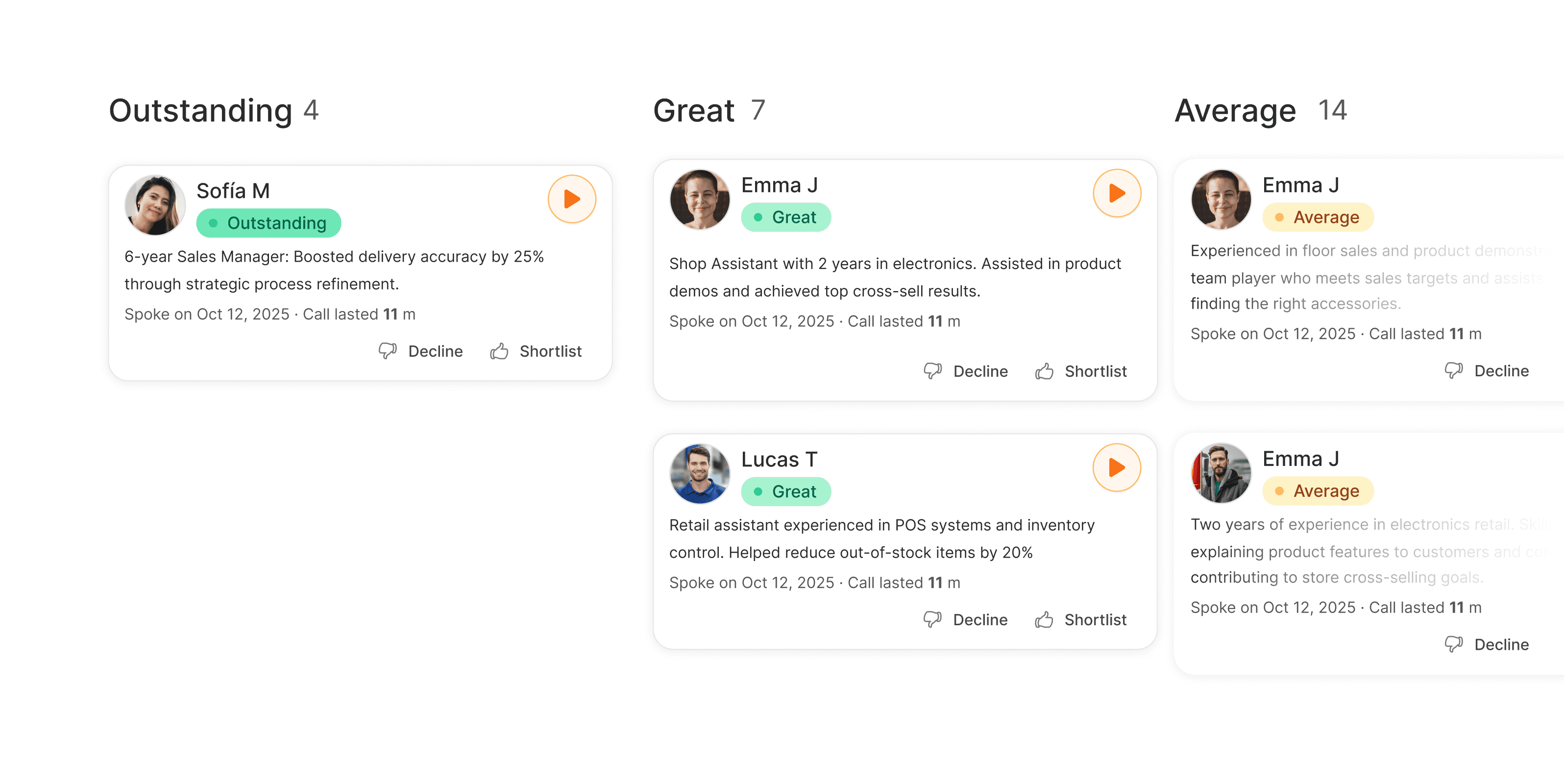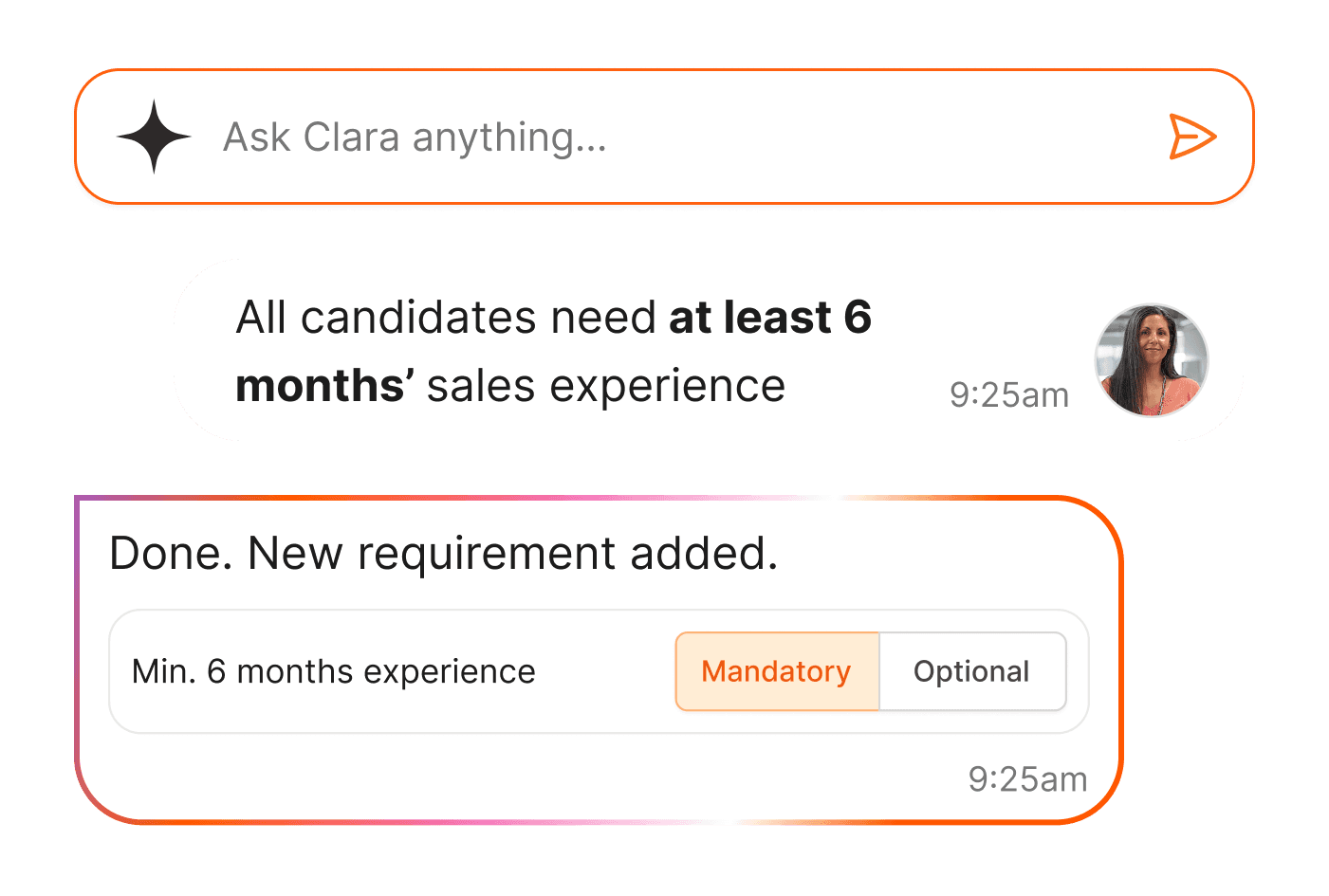 Clara aligns with your ATS and structured job requirements, ensuring that evaluation criteria reflect how roles are defined in your existing systems.