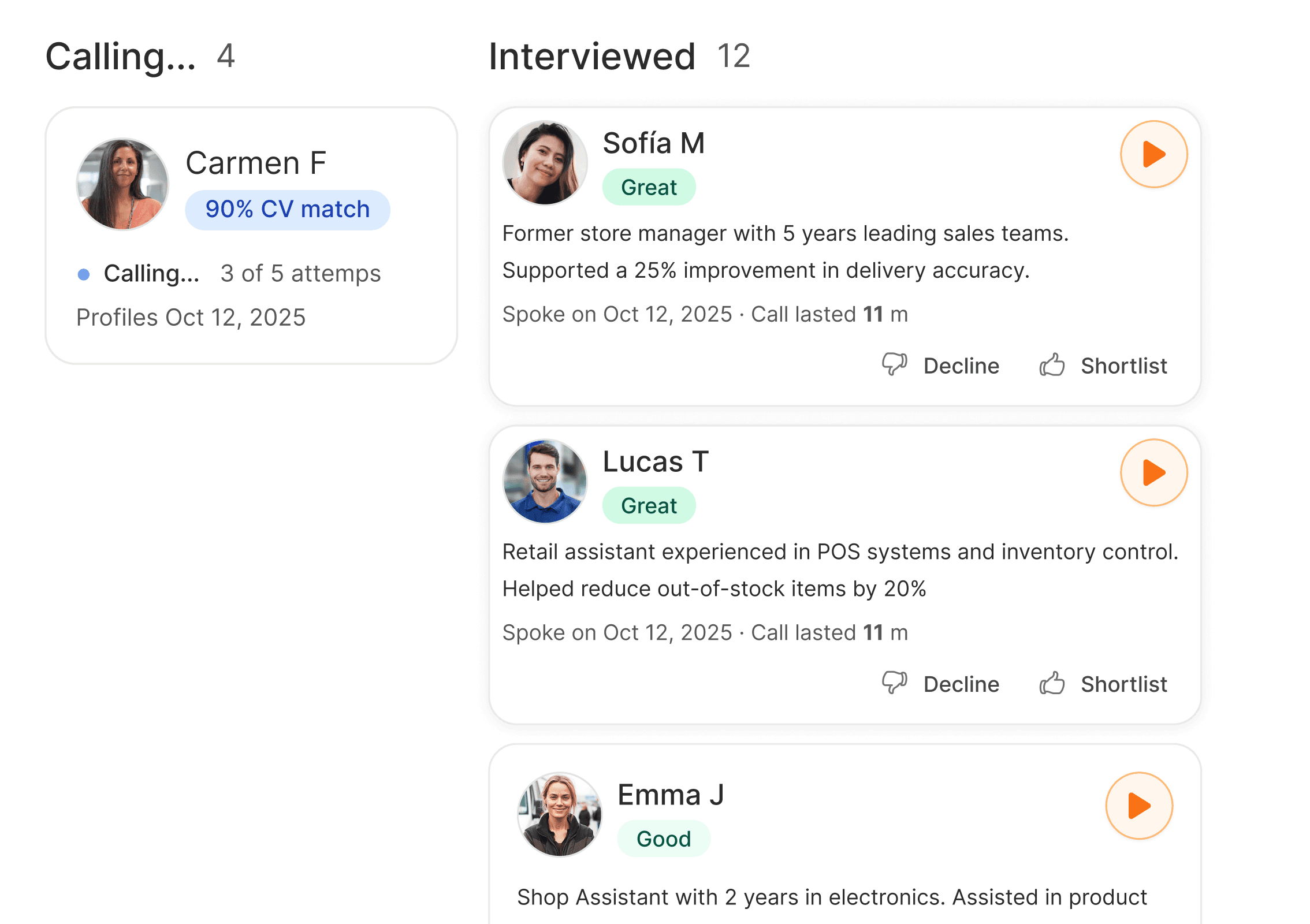 From shift patterns and pay to benefits and team culture, Clara answers candidate questions accurately in real time, so your team doesn't need to follow up after every call.