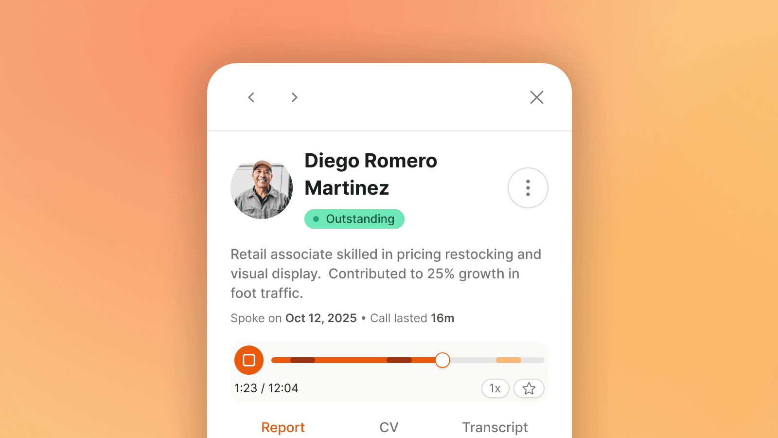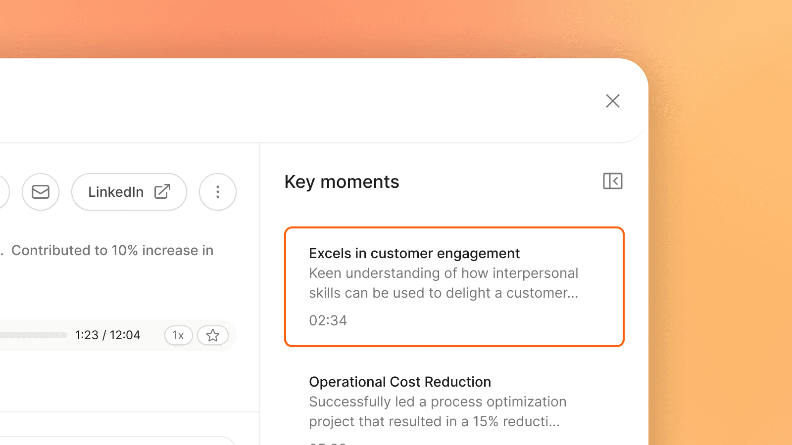 This changes the review from a linear exercise (play the whole thing) to a targeted one (go to what matters). For a recruiter with 20 profiles to review in an afternoon, that difference is the difference between getting through the day and not.