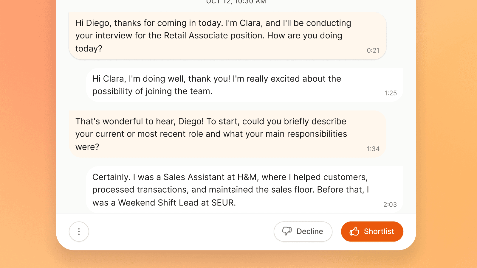 Clara AI's Interview Highlights turns every candidate report into a navigable audio experience. Click any AI assessment, jump to the exact moment in the interview, and verify the scoring without listening to a full 15-minute call.