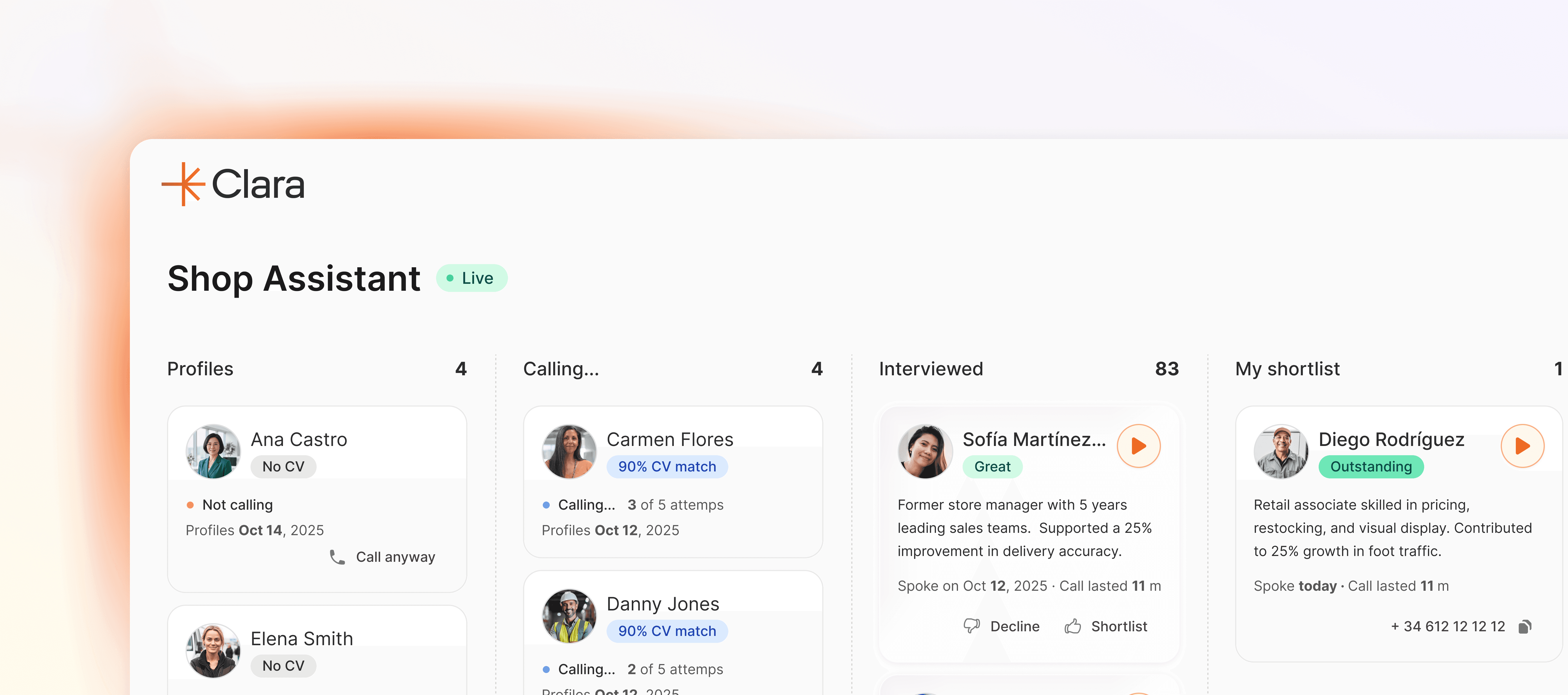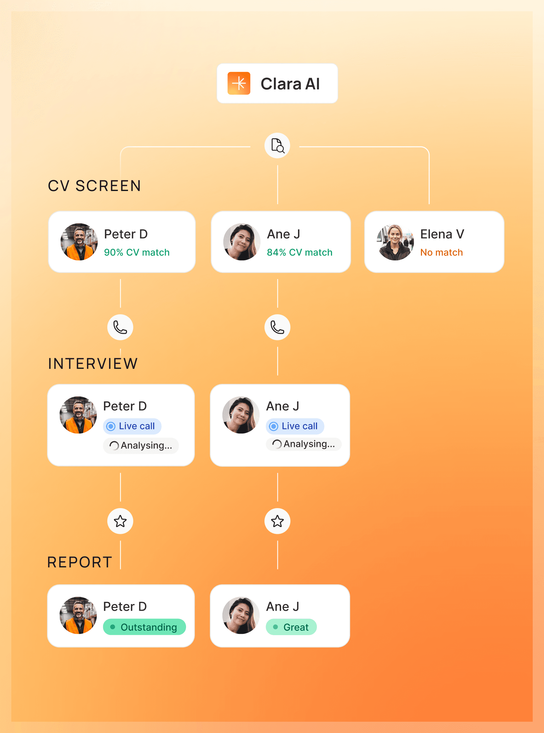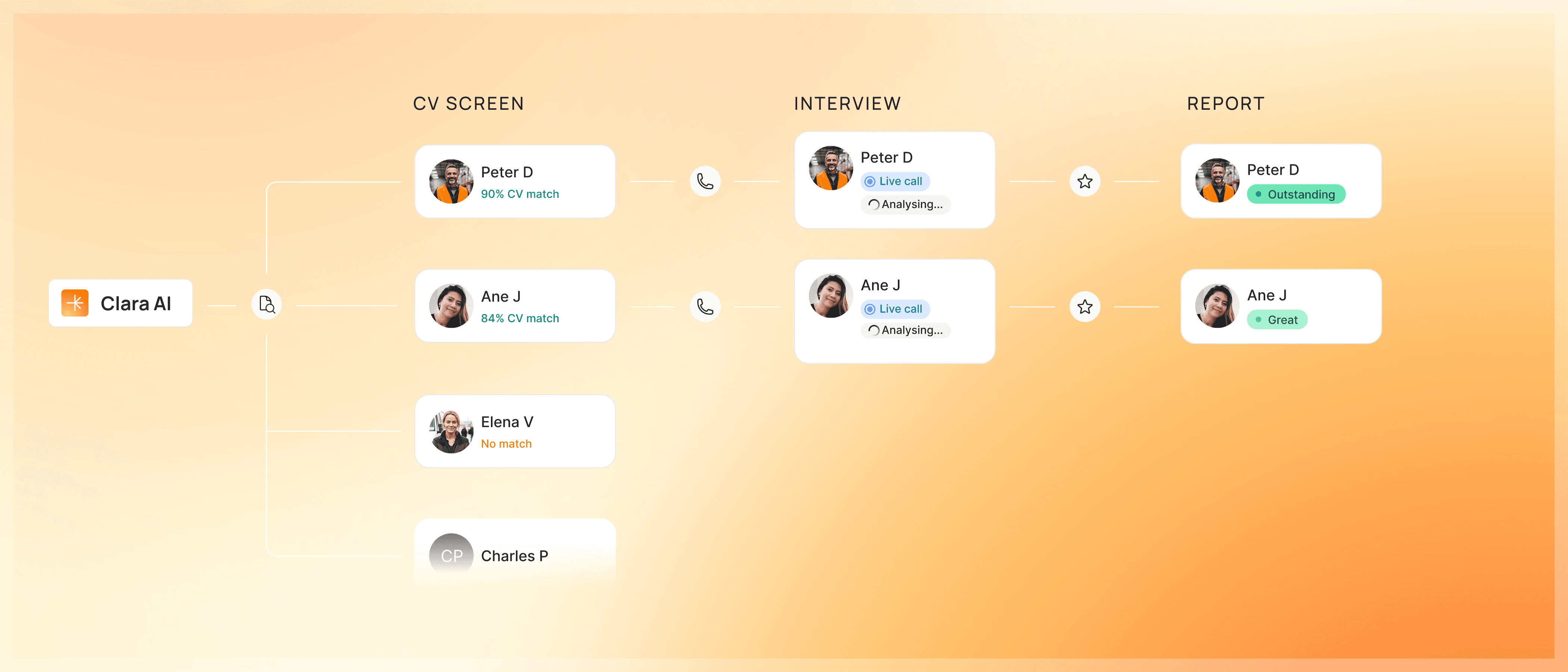 Clara automates screening from CV to interview to final report within minutes. Candidates are assessed, interviewed, and converted into structured evaluations without manual effort.