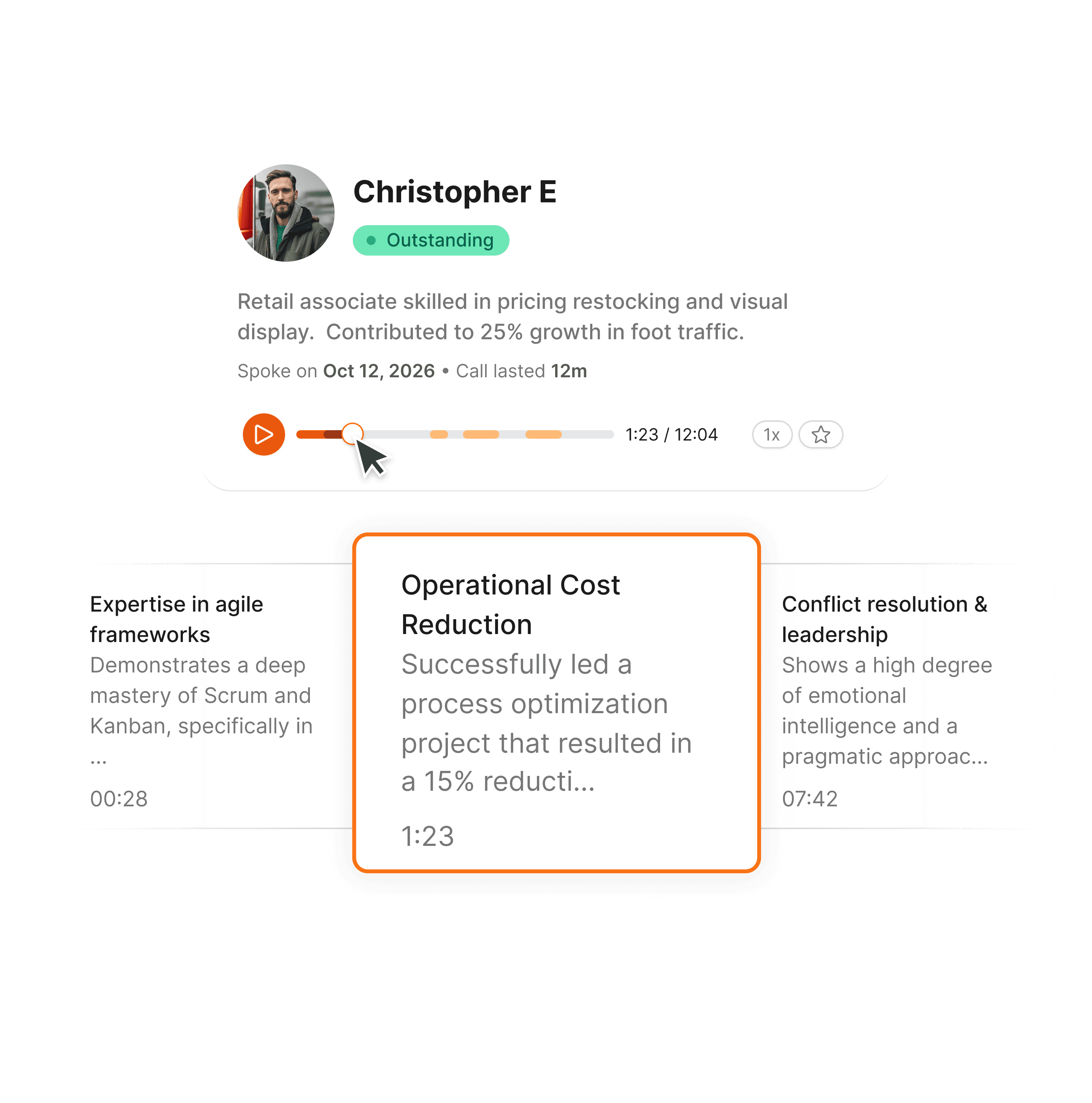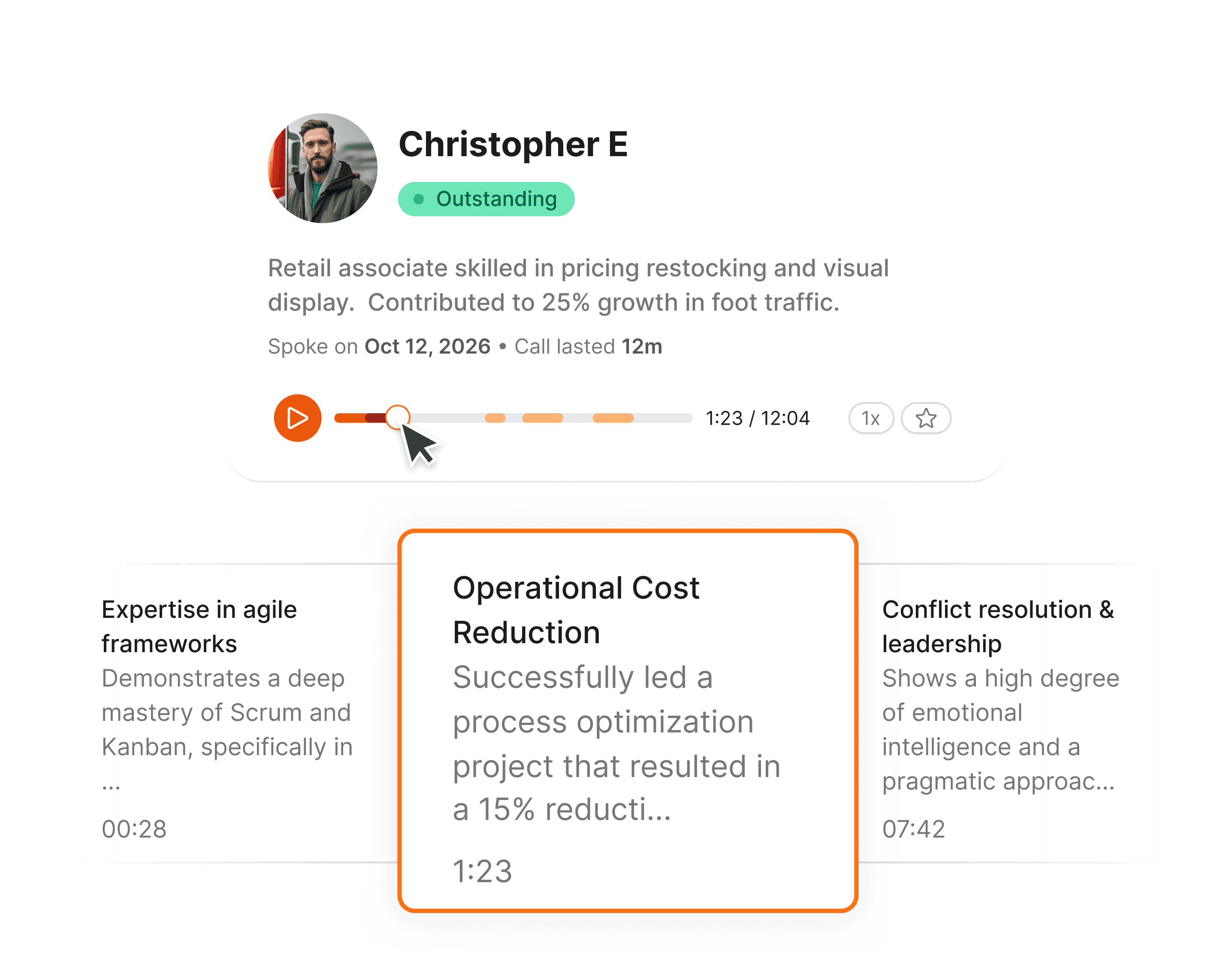 Clara highlights key moments from every interview, so hiring managers can jump straight to the most relevant answers.