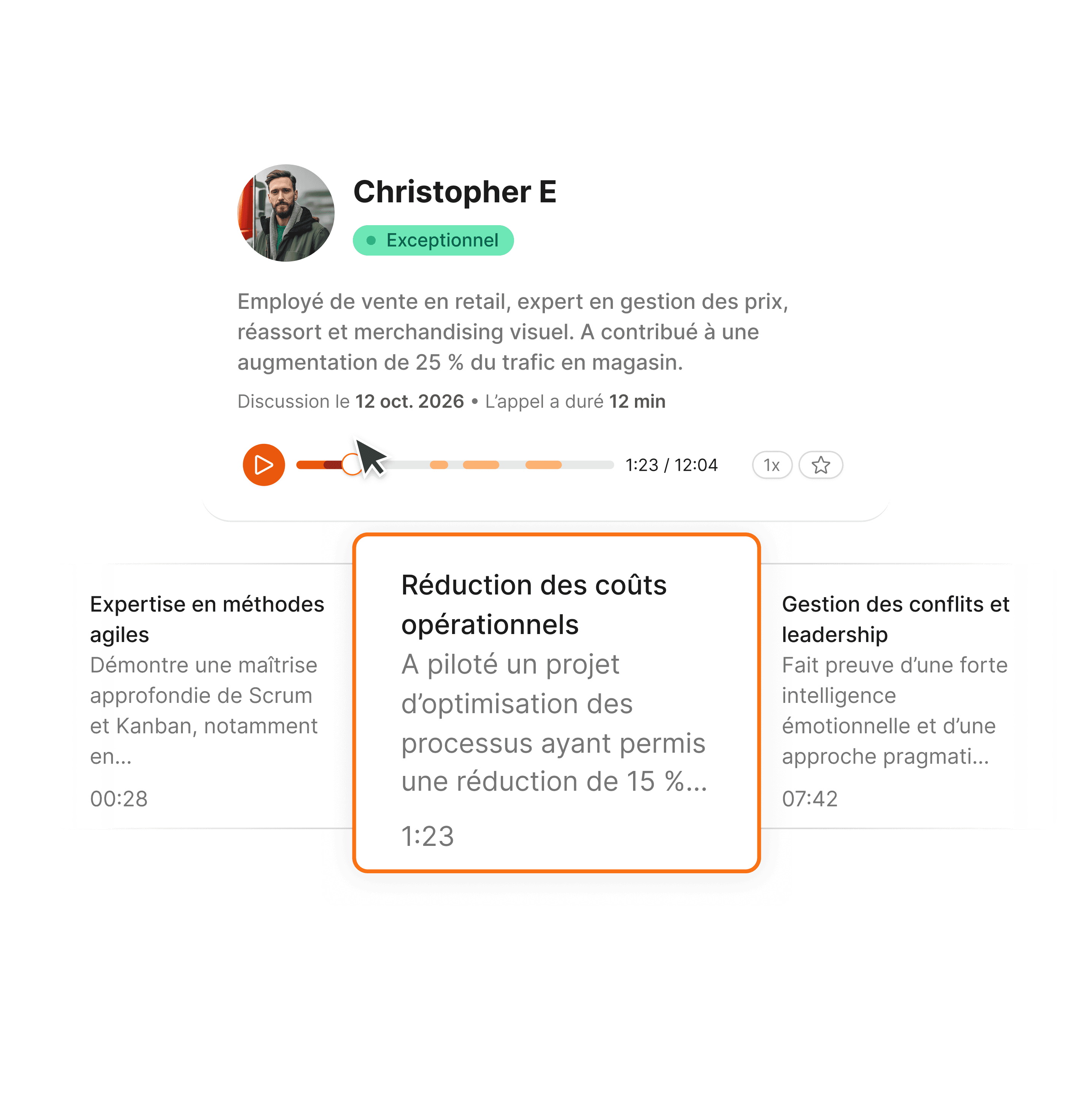 Clara met en avant les moments clés de chaque entretien, pour permettre aux managers d’accéder directement aux réponses les plus pertinentes.