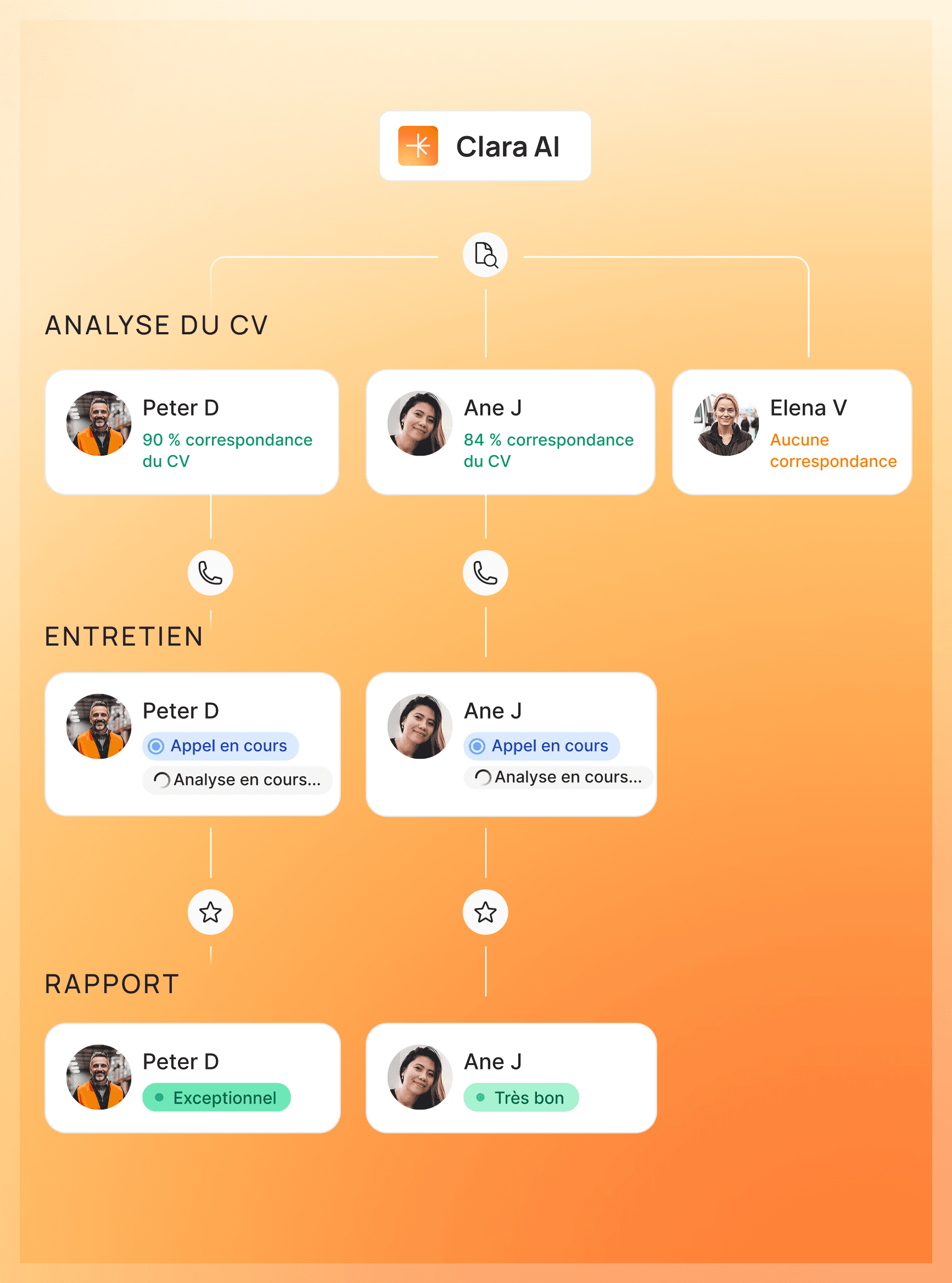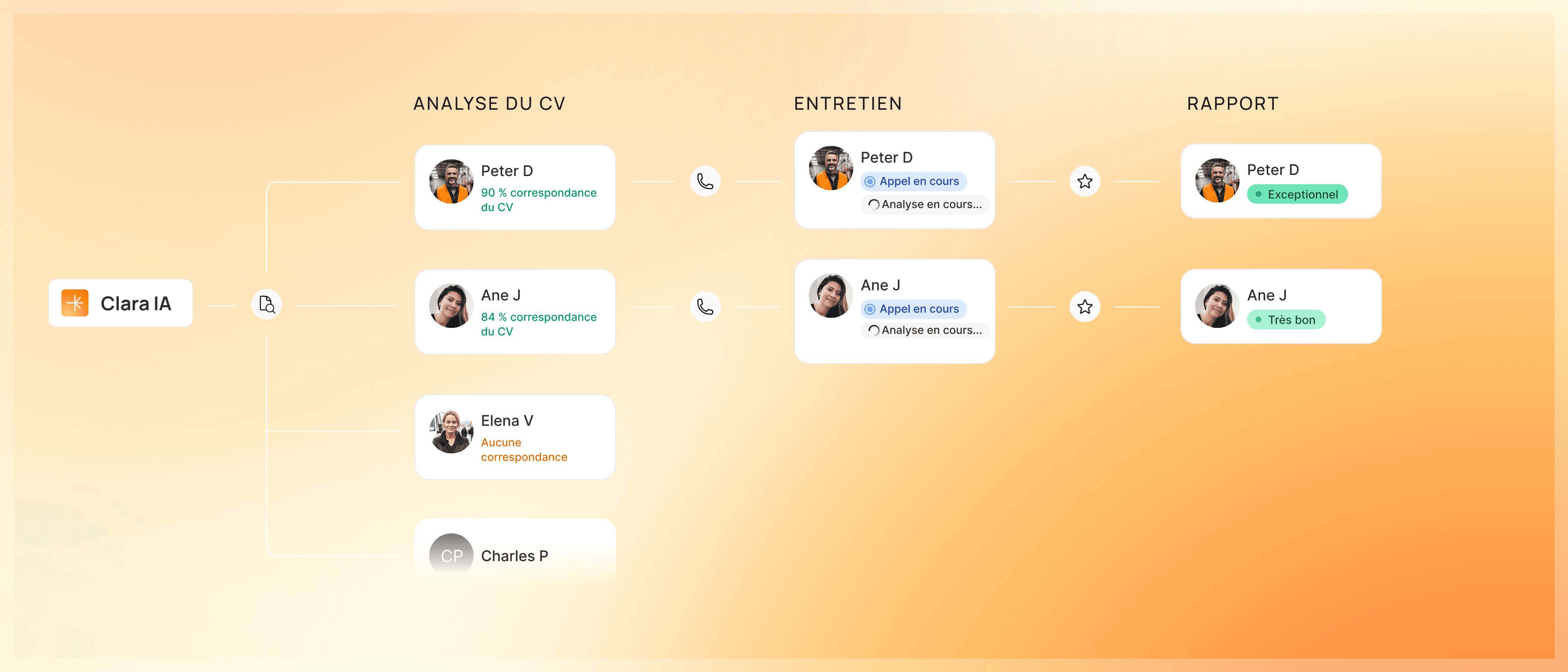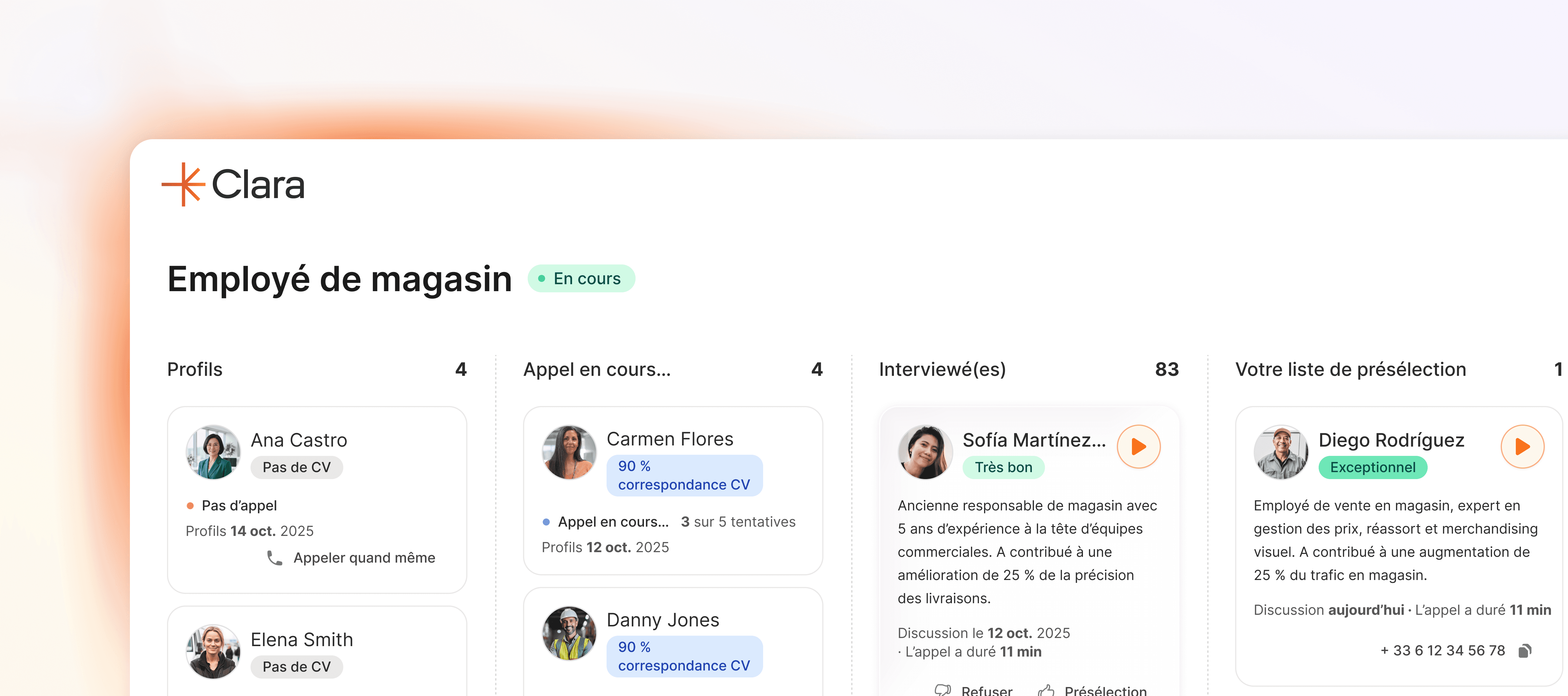 Clara vous aide à vous concentrer sur des tâches à forte valeur ajoutée comme l’engagement des meilleurs candidats, l’alignement avec les managers et la finalisation des recrutements.